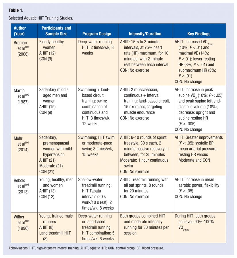In 2015, Elizabeth Nagle, PhD, Mary Sanders, PhD, and Barry A Franklin, PhD, published a metanalysis in the American Journal of Lifestyles Medicine entitled “Aquatic High Intensity Interval Training for Cardiometabolic Health: Benefits and Training Design.” The authors included in their analysis a table showing five studies around aquatic HIIT and studies’ key findings.
