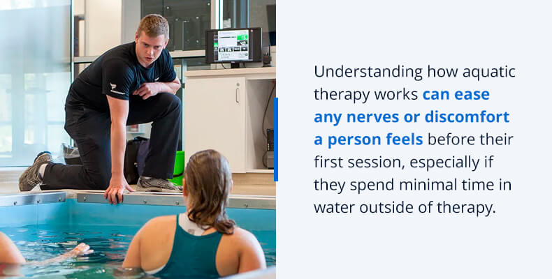 An individual who has never tried aquatic therapy may feel nervous at first. Express understanding, patience, compassion, and empathy as you interact with patients. Give them time to explore the therapy pool if they would like to before they begin their first session. You should also answer any questions they have and offer encouragement as they progress through exercises and meet their goals.