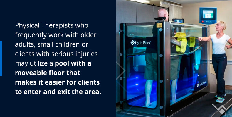Physical Therapists who frequently work with older adults, small children, or clients with serious injuries may utilize a pool with a moveable floor that makes it easier for clients to enter and exit the area. For example, the HydroWorx 2000 and 1200 Series pools feature a fully moveable floor that can be raised and lowered in less than 30 seconds to allow for a safe entry to the therapy session.